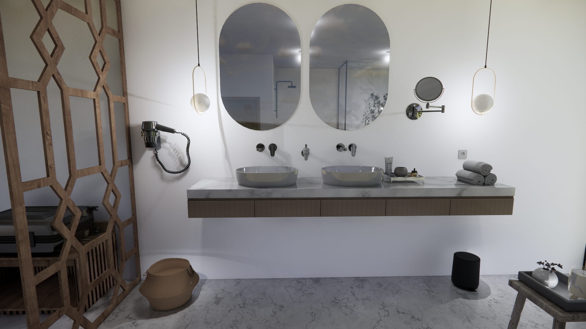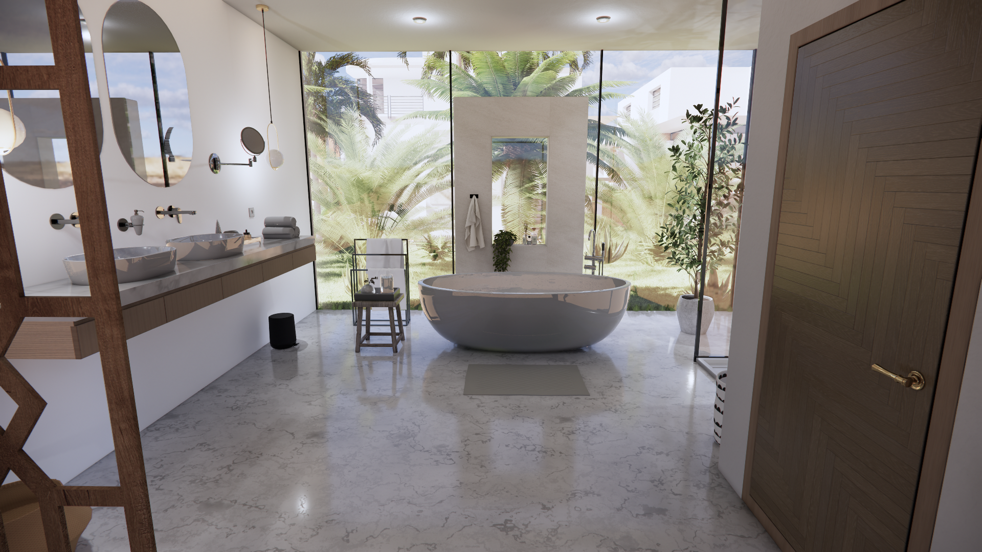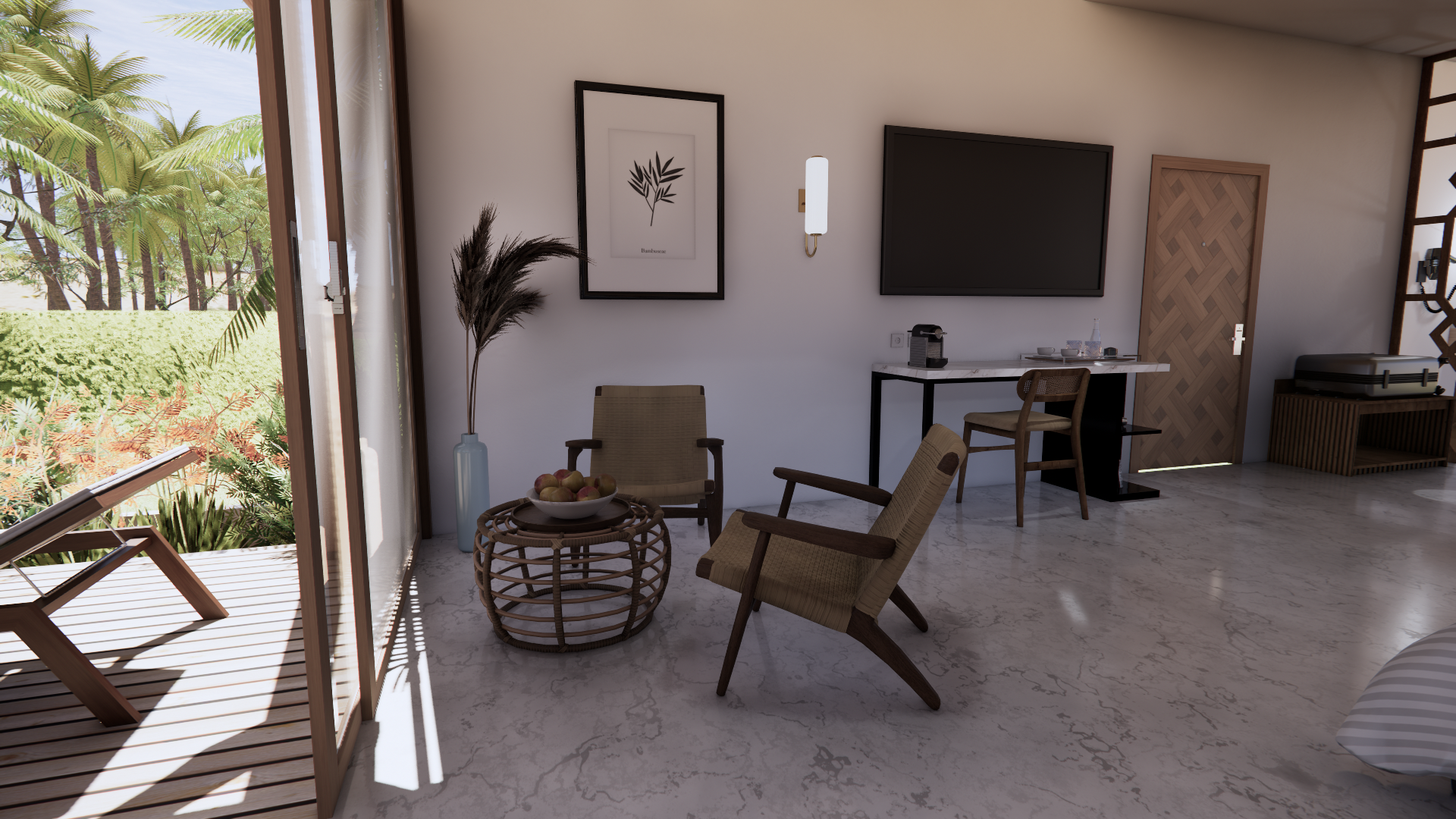 A suite in neutral tones, complemented by an intimate wooden terrace and a private pool.